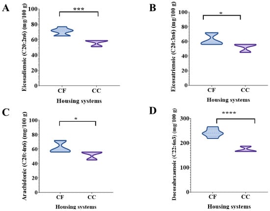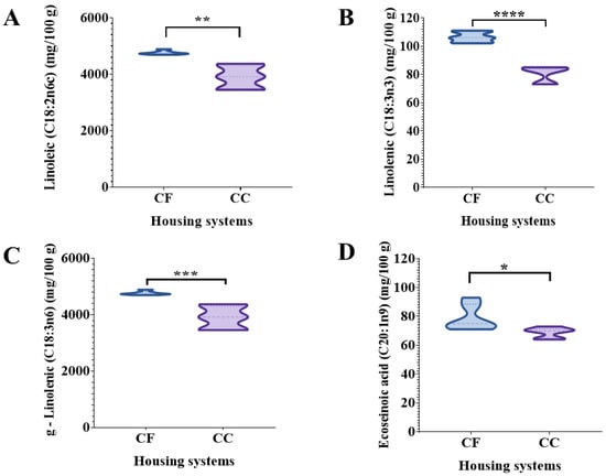Comparison of polyunsaturated fatty acid concentrations (mg/100 g) in egg yolks at the 34th week from hens housed under the conventional cage (CC) and cage-free (CF) systems. Data are presented as the means ± SEM (n = 5 pools/system/week). (A) linoleic acid; (B) linolenic acid; (C) g-linolenic acid; (D) eicosenoic acid. * p < 0.05; ** p < 0.01; *** p < 0.001; **** p < 0.0001 (Student’s t-test).