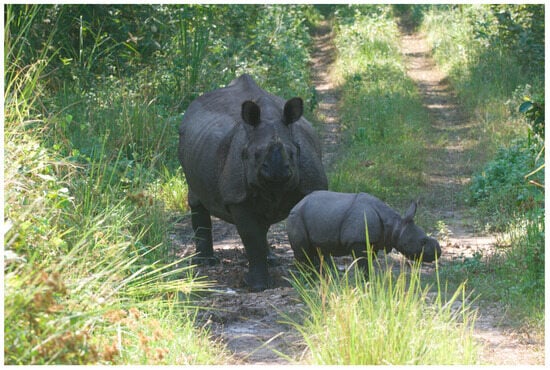 - Subedi, N.; Lamicchane, B.R.; Amin, R.; Jnawali, S.R.; Jhala, J.V. Demography and viability of the largest population of greater one-horned rhinoceros in Nepal. Glob. Ecol. Conserv. 2017, 12, 241–252. [Google Scholar] [CrossRef]