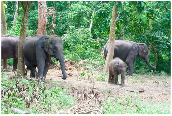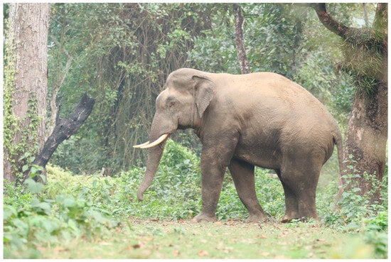 - Sukumar, R. Ecology of Asian elephant in south India. I. Movement and habitat utilization patterns. J. Trop. Ecol. 1989, 5, 1–18. Available online: https://www.jstor.org/stable/2559605 (accessed on 1 May 2023). [CrossRef]