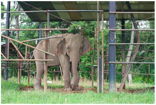 Captive elephants throughout South Asia suffer from a lack of veterinary care as well as low standards for their management, handling, and husbandry, and Nepal is no different []. However, Nepal’s elephants face vastly different situations than those in the villages of Laos, the camps of Thailand or Myanmar, or the temples and streets of India. There have been studies within other Asian countries demonstrating a range of successful human–elephant relationships, a historical acceptance of elephants as community members, and even positive health and welfare implications of living in certain camp situations (for example, see Bansiddhi, et al., 2020; Lainé, 2019; Lehnhardt and Galloway, 2008). However, given the small number of both wild and captive elephants residing in Nepal, until recently, consideration of their welfare has largely escaped the interest of the international research community (see Szydlowski, 2024). In addition, the housing, nutrition, and management styles used within Nepal vary greatly compared to those seen elsewhere in Asia, making assessing elephant welfare even more difficult.
