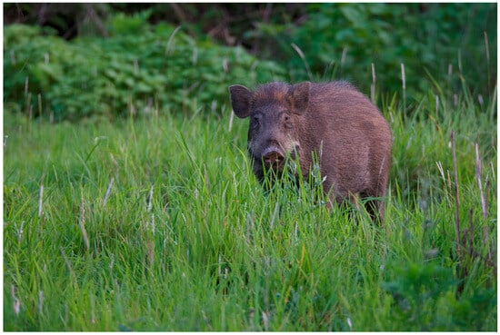 For example, captive elephants residing in private hattisars share their spaces with domesticated livestock as well as local wildlife such as wild boar (Sus scrofa, see Figure 14, four species of deer, rhinos, and many smaller species. These elephants travel through protected areas on the way to, and during, tourist safaris each day. Approximately 23% of these captive individuals carry tuberculosis, and others carry elephant endotheliotropic herpes viruses []. Other diseases such as rabies, foot and mouth disease, respiratory infections, tetanus, salmonellosis, and internal or external parasites have all been reported in Nepalese elephants [,]. Concerns regarding the passage of these diseases into wild populations have become a reality, with fatalities among wild elephants and greater one-horned rhinos increasing [,].