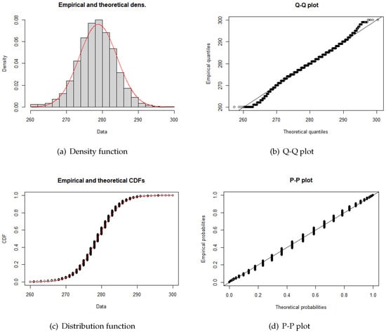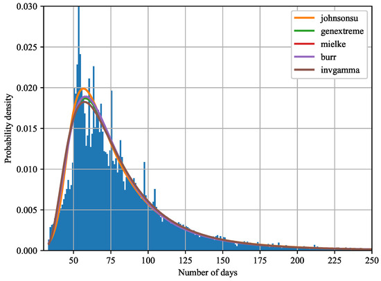 For cases not found in the literature, we needed to select from the fitted distributions the distribution that best fit the extracted sample using the maximum likelihood method [49]. To achieve this, we needed a metric that gives the “goodness” of each distribution. Based on these values, we could develop a ranking of which distribution best fit our data. We examined which of the given distributions best fit the data by several metrics.