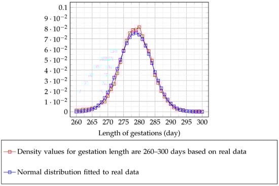 The length of gestation follows a normal distribution in reality. According to the literature, the gestation period of a cow is between 260 and 300 days. We left the real data between these two values and fitted the distributions to them.
