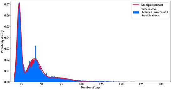 The basic oestrus cycle of the cow averages 21 days in duration. As with the first insemination, in the case of late-onset oestrus, we try insemination again after the next 21 days. Late detection of oestrus may be repeated several times. This makes the distribution of the real data a distribution with several local maxima. When fitting the curve, it is not suitable to fit a known continuous distribution curve, but it is necessary to use some kind of mixed model to cover the important local maxima.