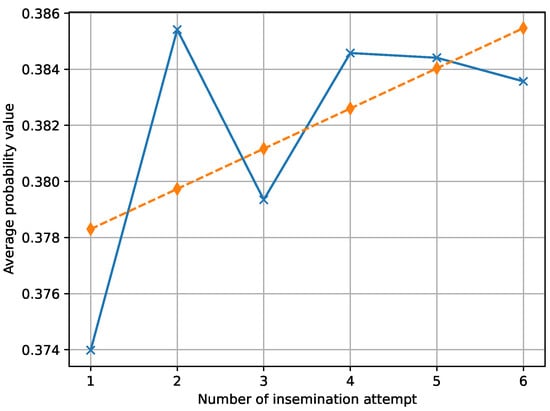 The average success rate was calculated from data from the largest site and had a constant value of , which was obtained by taking all the insemination attempts that occurred on the dairy farm (17 insemination attempts were the most) and calculating the percentage of successful inseminations from the total attempts. This value is a good approximation of the expected value of pregnancy success. The simulation simply generates a pseudorandom number between 0 and 1, and if it generates a value greater than a given constant for a given insemination attempt event, then we say that the insemination has failed, otherwise it has succeeded. A careful application of a microsimulation enabled us to investigate complex models when the necessary data are available in the form of empirical distributions or at least histograms, and we wanted to understand the consequences of changes in decision protocols applied to the underlying statistical model.