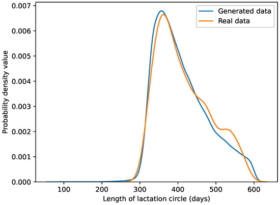 The first statistical test we used was the two-sample Kolmogorov–Smirnov test, the null hypothesis of which was that the two samples, the generated and real data, were derived from a theoretical distribution [57]. The test takes as the distribution function of the two samples to be compared, at each discrete point, the absolute value of the difference between the two samples. If this value is greater than a given significance level and sample size, the hypothesis is rejected. At a significance level of , the p value of the test is , which means that the hypothesis is not rejected.