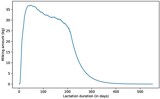 From the point of view of the farm’s profitability, the most important key issue is the level of milk production of cows. The amount of milk given by a cow depends, to a large extent, on the keeping habits of the dairy farm and especially on the feeding habits. During the study, the average milk production of the six dairy farms was calculated as a function of the days since calving. This is shown in Figure 7. It is clear that the reduction in milk volume is expected to occur on day 217 of lactation. Based on the lactation curve, it can be said that after the 249th day, the amount of milk produced does not even reach 10 kg.