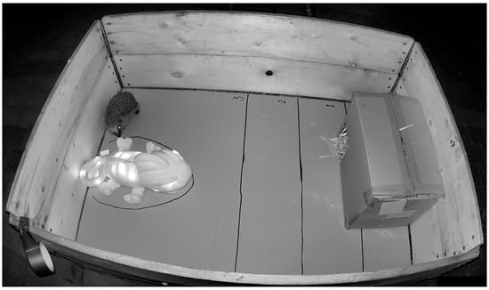 The novel arena consisted of a wooden pallet frame with a solid, wooden pallet base (dimensions inside the arena: length 104 cm, width 76 cm, and height 38 cm). The base was covered by a large piece of cardstock thick paper in a light grey colour, covering the whole base of the arena. The novel object was placed in the end of the test arena, 60 cm from the nest box containing the hedgehog subjected to the personality test, which was placed in the opposite end of the novel arena. The nest box was added to the novel arena just before the test started. The novel arena was placed under a cover by a dark-blue garden gazebo for the purpose of standardising the weather conditions and shielding the arena against rain.