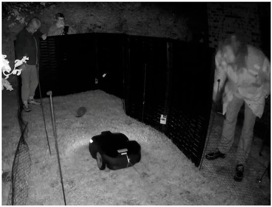 A photo from the surveillance camera used during the encounter tests, illustrating the experimental design. A range of safety precautions for the tests can be seen: (1) a person standing on the right side of the test area stepping in to manually turn off the robotic lawn mower by pushing the (visual) button on the shield of the mower; (2) the rope attached to the back of the mower (with a person pulling it in the other end); and (3) the hedgehog rehabilitator standing inside the test area next to the hedgehog ready to intervene, if necessary. The two persons standing in the vicinity of the hedgehog tested (the hedgehog rehabilitator and the person recording with the handheld FLIR E54 Thermal Imaging camera) remained the same throughout all tests and were cautious to behave in the same manner during all tests.