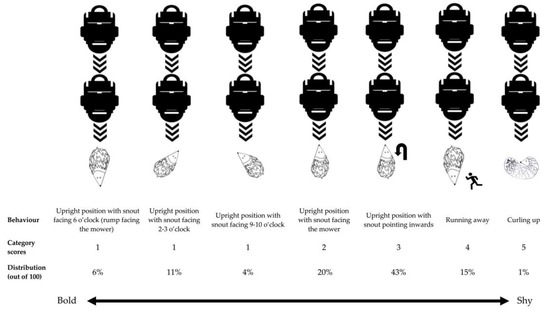 An overview of the results from the encounter tests with a robotic lawn mower. “Behaviour” describes the behaviour exhibited by the hedgehogs. “Category scores” indicate the degree of shyness or boldness of the behaviour, with 1 being the boldest and 5 being the shyest. “Distribution” denotes the frequency of the specific behaviours, in percentage, out of 100 tests conducted with a total of 50 different hedgehogs. The line with arrows indicates the gradient of shyness or boldness of the behaviour exhibited by the hedgehogs tested. At the beginning of each test, the hedgehog was placed in an “upright position with snout pointing inwards”.