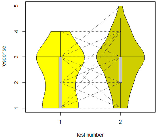 Behavioural responses of the individuals during the first and the second encounter tests with a robotic lawn mower (CLMM: p = 0.021). “Response” indicates the behavioural categories 1–5, with 1 being the boldest and 5 being the shyest. Violin and box plots: the horizontal line shows the median, with the box extending from the lower to the upper quartiles and the whiskers to the data extremes. The dashed lines indicate repeated measures (i.e., connecting responses by the same individual between tests 1 and 2).