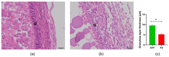 Comparison of SYFs and F6 granulosa layer thickness. (a) HE morphology of small yellow follicle. (b) HE morphology of F6 follicle. (c) Comparison of granulosa layer thickness between small yellow follicle and F6 follicle. Scale bars: 20 μm (40×). G: granulosa layer, n = 5, mean ± SEM, ** means the difference is extremely significant (p < 0.01).