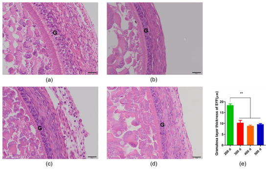As shown in Figure 1, we measured the thickness of the granulosa layer of SYFs and F6s. The results showed that, as the follicles developed, the tissue morphology of the granulosa layer of the oocyte also changed, and the thickness of the granulosa layer of the F6s was significantly lower than that of the SYFs. We also tested and compared the thickness of the granulosa layer of SYFs at 200 d, 300 d, 400 d, and 500 d (Figure 2). The results showed that the granulosa layer thickness of SYFs at 200 d was significantly higher than that of other periods.