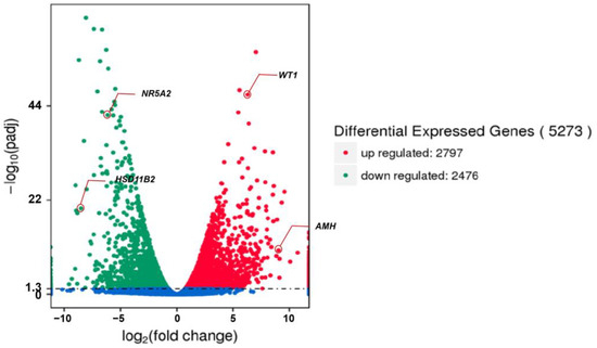 We first examined the global gene expression levels. Based on the FPKM value, it was found that the PHGCs and POGCs had an average of 55.55% and 58.23% genes with a very low expression level (i.e., 0 < FPKM value < 1), respectively. Furthermore, 5.076% and 4.473% of the genes were expressed at a high abundance (i.e., 60 < FPKM value) in the two groups (Table 4). A total of 5273 genes were differentially expressed in the PHGCs and POGCs (Supplementary Table S1). In the PHGCs, the expression level of 2797 genes was significantly up-regulated, and the expression level of 2476 genes was significantly down-regulated (p < 0.05) compared with the POGCs (Figure 3). We can observe that, in POGCs, genes involved in the synthesis of steroid hormones, such as HSD11B2 and NR5A2, have the highest fold increase. On the other hand, genes with the highest fold reduction in POGCs, such as AMH and WT1, have the function of inhibiting the synthesis of steroid hormones.