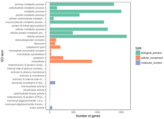 The DEGs between the PHGCs and POGCs were annotated, and the functional classification of the top 30 GO terms (including the biological process, cellular component, and molecular function) for all DEGs is shown in Figure 4 and Supplementary Table S2. The DEGs of the PHGCs vs. the POGCs were mainly enriched in the biological process. In the biological process category, the DEGs’ enriched GO terms were classified into the primary metabolic process, carbohydrate metabolic process, etc. In the cellular component category, the enriched GO terms of interest included the ribonucleoprotein complex, ribosome, and cytoplasmic parts. In the molecular function category, the DEGs were enriched in GO terms centered on the structural constituent of ribosomes and mannosidase activity.