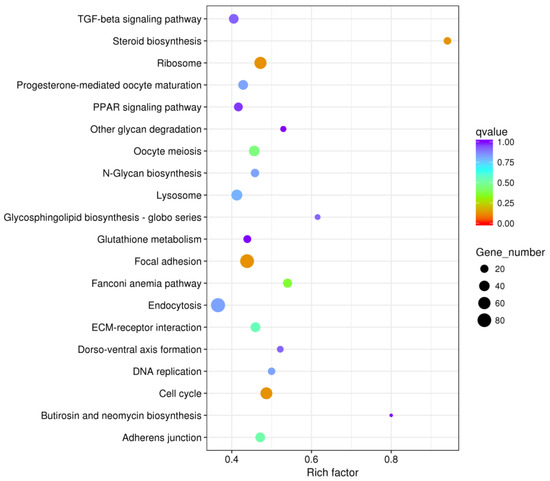 The DEGs between the PHGCs and POGCs were assigned to one or more KEGG annotations and were mapped to 152 KEGG pathways. These enriched pathways included steroid biosynthesis, the TGF-beta signaling pathway, steroid biosynthesis, and focal adhesion (Supplementary Table S3). The top 20 data outputs for significant KEGG pathway enrichment are shown in Figure 5. A significant KEGG pathway enrichment of the POGCs compared with the PHGCs was the steroid biosynthesis pathway, with 14 DEGs; however, the largest number of DEGs was in the metabolic pathway (Table 5). Genes in the cell cycle and glycosaminoglycan biosynthesis pathways had higher expression levels in the PHGCs, whereas genes related to the ribosome and steroid biosynthesis pathways were abundantly expressed in the POGCs.