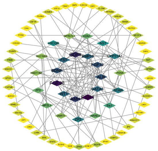 A STRING analysis was performed to investigate the potential interaction network of the DEGs (Figure 6). The results showed that ESR1, WT1, AMH, etc., interacted significantly with each other and connected with many other DEGs, suggesting their role in follicle development. In addition, not all DEGs showed an association with other DEGs because their functions were either unclear or unrelated to each other; these were not included in the analysis.