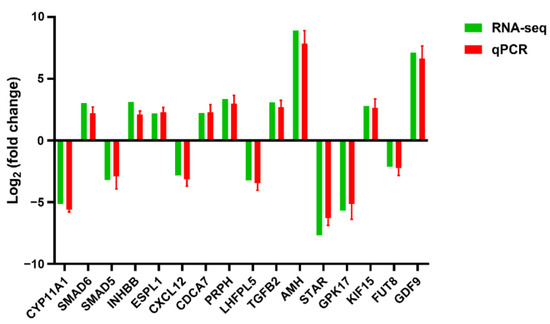 To validate the RNA-seq results, the expression level of several selected up- and down-regulated genes was confirmed via quantitative real-time PCR (qRT-PCR). Total RNA was extracted from the granulosa cells of the PHGCs and POGCs using RNAiso Plus (TaKaRa, Tyoto, Japan). A NanoDrop spectrophotometer (Thermo Fisher Scientific, Waltham, MA, USA) was used to determine the concentration of the RNA. The total RNA (2 µg) was reverse-transcribed using the Primescript RT Master Mix (TaKaRa, Tyoto, Japan). The primers were designed online using Primer3 Input (version 0.4.0, http://bioinfo.ut.ee/primer3-0.4.0/ (accessed on 10 May 2023)) and synthesized by Shanghai Sangon Co., Ltd. (Shanghai, China). The sequences of the primers are listed in Table 1. The RT-PCR reactions were performed using the QuantStudioTM Design and Analysis software V1.4 with the SYBR Green Master Mix. Each reaction was prepared in a total volume of 20 μL, containing 10 μL of the SYBR Green mix, 2 μL of diluted cDNA, and 0.2 μM of each primer. Amplification was carried out with the following cycling parameters: heating at 95 °C for 10 s, 40 cycles of denaturation at 95 °C for 5 s, annealing at 58 °C for 30 s, and extension at 72 °C for 10 s. Each sample was analyzed in triplicate, and negative controls were included in all qPCR runs. The relative expression of each mRNA was calculated using the 2−ΔΔ Ct method [22]. In addition, β-actin was used to normalize the abundance of the target mRNA.