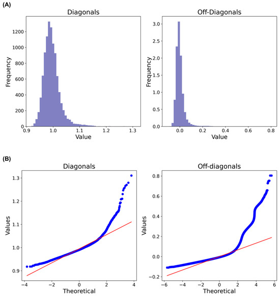 (A) Histograms and (B) QQ plots of the diagonal and off-diagonal values of the genomic relationship matrix.