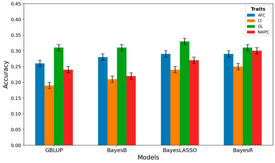 The comparison of results demonstrates that Bayesian methods, especially BayesLASSO and BayesR, consistently outperformed GBLUP in predicting CI and NAIPC, showcasing higher increases in accuracy for these traits. The AFC predictions using Bayesian methods showed slight advantages but not as prominently as for CI and NAIPC. Additionally, GL predictions did not display a notable variance in accuracy among the methods, although BayesLASSO showcased a slight edge. The superior accuracies observed in Bayesian methods for CI and NAIPC might be explained by their enhanced capacity to effectively capture the genetic factors that contribute to these traits. Bayesian methods excel in handling complex genetic architectures by considering various levels of effects for individual markers. This flexibility allows them to identify and account for specific genetic variants with varying contributions to the traits. In contrast, GBLUP, while widely used, may oversimplify the genetic architecture by assuming a constant effect for all markers, potentially missing out on crucial information embedded in the genetic variations. Therefore, the Bayesian methods, with their adaptability to diverse genetic scenarios, showcase improved predictive performance, providing more accurate estimates for CI and NAIPC [72].