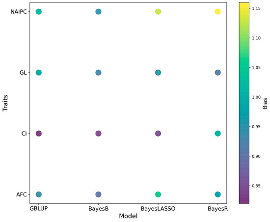 The bias in genomic predictions for all reproductive traits is shown in Figure 4. When comparing biases among different models for each trait, notable variations emerge. In the context of AFC, the GBLUP model showed a bias of 0.94, and BayesB followed closely with a bias of 0.90. However, BayesLASSO presented a notably higher bias at 1.06, and BayesR also exhibited a slightly increased bias of 0.98. For CI, GBLUP demonstrated a bias of 0.82, and BayesB had a slightly lower bias at 0.84. Meanwhile, BayesLASSO resulted in a bias of 0.85, and BayesR showed a similar bias at 1.01, highlighting a mild increase. When assessing GL, GBLUP stood at 0.99, closely resembling the biases of BayesB and BayesR with values of 0.93 and 0.91, respectively. BayesLASSO had a slightly increased bias at 0.96. For NAIPC, the biases were more varied. GBLUP reported a bias of 1.01, while BayesB had a slightly lower bias at 0.95. BayesLASSO presented a higher bias of 1.13, and BayesR showed the most increased bias of 1.16.