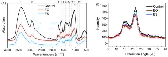 Structural changes in chemical bonding with FTIR (a) and crystallinity with XRD (b). Control, untreated; EO, once expansion; ES, secondary expansion.