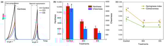 Compressive curves of TPA and calculation results of the texture properties of different treatments. (a) Two cyclic compression curves in texture analysis; (b) Hardness and chewiness calculated from compression curves; (c) Springiness index and cohesiveness calculated from compression curves. Control, untreated; EO, once expansion; ES, secondary expansion. Significant differences between treatments are indicated by different letters (p < 0.05).