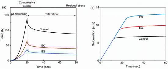 Compressive curves of stress relaxation and creep deformation curves of different treatments. (a) Representation of compressive stress and relaxed elasticity; (b) Representation of creep deformation. Control, untreated; EO, once expansion; ES, secondary expansion.