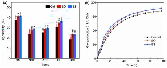 After 48 h incubation, expanded samples showed significantly higher digestibility of DM, NDF, ADF, CL, and HCL compared to the Control (Figure 4a, p < 0.05). The EO and ES increased the digestibility of DM, NDF, ADF, CL, and HCL by 3.8–5.3%, 4–5.1%, 3.7–5%, 4.6–6.0%, and 5.3%, respectively. Figure 4b showed that the Control had the lowest gas production, and there was a gas production delay period. There was no significant difference in gas production between EO and ES after 96 h of incubation. The results of gas production model fitting showed that model 1 was the best fit for Control, while model 2 was the best fit for EO and ES. The maximum theoretical gas production of EO and ES was composed of fast fermentation components and slow fermentation components, and the EO was slightly higher than the ES, whereas the gas production rates in ES were higher than those in EO (Table 2).