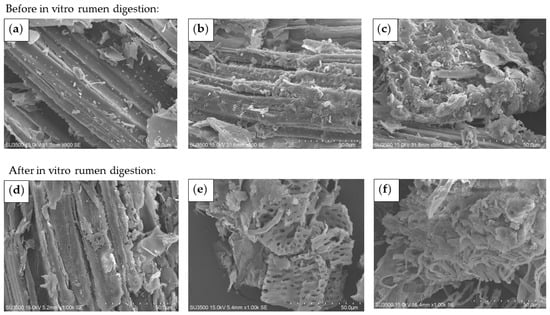 Scanning electron microscopy (SEM) of buckwheat straw before and after in vitro rumen digestion. (a–c) Untreated, once-expanded, and secondary-expanded buckwheat straw before digestion; (d–f) Untreated, once-expanded, and secondary-expanded buckwheat straw after digestion.