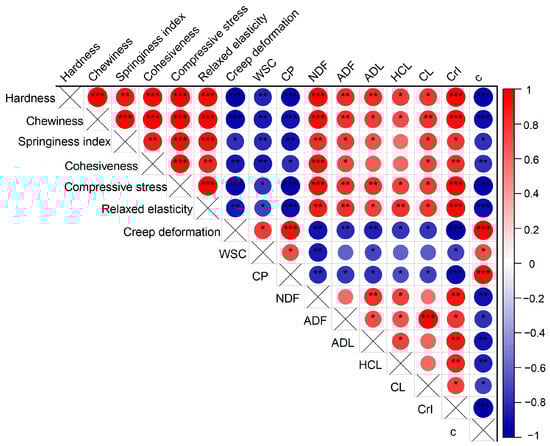 Correlation of mechanical properties, chemical characteristics, and gas production rate. Positive correlations were shown in red, and negative correlations were shown in blue. The dot color and size were proportional to the correlation coefficient, and Pearson’s correlation coefficient and the corresponding color were shown on the ruler on the right side. × means that correlations between the same items are ignored. * p ≤ 0.05, ** p ≤ 0.01, *** p ≤ 0.001.