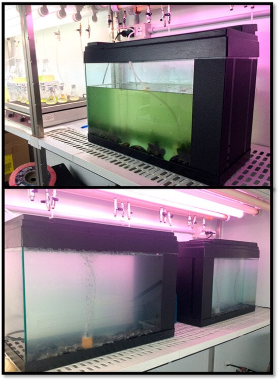 Furthermore, during the whole period, mussels were fed daily with algal cultures of Isochrysis galbana and Tetraselmis suecica with a dose equal to 3% of mussels’ dry weight, ration considered enough to fulfill mussels’ daily energy requirements [47]. The algae were cultured using filtered seawater starting from small volume (50 mL) until massive algal production (150–200 L), via intermediate volumes. Before feeding, algal cell densities were measured using Bürker chamber, to ensure the right concentration to add to each experimental tank.