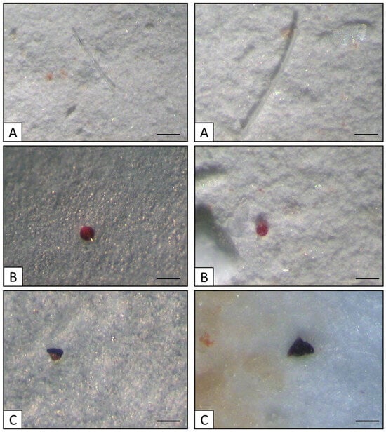 Finally, filters were observed under a stereomicroscope (Leika MZ6, Leica Microsystem Ltd., Heerbrugg, Switzerland), images were taken using a digital camera (JVC-C1381, JVC, Yokohama, Japan) (Figure 2) and each particle was measured along its longest dimension, using Leica IM500 software (Leica Microsystem Ltd., Heerbrugg, Switzerland). A visual assessment was applied to recognize and classify the spiked microplastics according to the rules of [51] and the hot needle test [52].