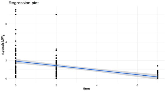 On the values relating to “n. particles MPs/g” a linear regression analysis was performed to verify the possible existence of a linear relationship between the number of MPs particles per gram and sampling times (T0, T2, and T7 group). From the regression plot (Figure 3, Table 3), it is possible to observe a statistically significant decrease (p Value 2.5 × 10−14) in the number of MPs found per gram of soft tissue of the analyzed mussels after 7 days of depuration process (group T0: average 2.17 MPs/g; group T2: average 0.49 MPs/g; group T7: average 0.27 MPs/g). This decrease, although already present after 2 days, was not statistically significant, but instead, it became so after 7 days of depuration.