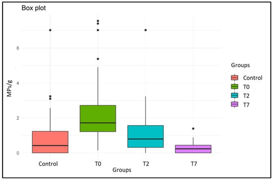 Box plot representing the number particles MPs/g differences in experimental groups. Control group: organisms collected at the end of the 7 days of acclimatization phase; Group T0: organisms collected at the end of the 3 days of exposure to MPs; Group T2: organisms collected at the end of the 2 days of depuration (microbiological depuration); Group T7: organisms collected at the end of the 7 days of depuration (experimental depuration for MPs).