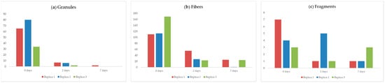 Graphical representation of the number of granules (a), fibers (b), and fragments (c) in the three experimental replicates. Error bars = Standard deviation.