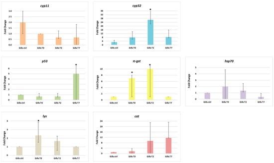 Gene expression results calculated with the 2−ΔΔCT method [54]. Bar graph presentation of the fold change in target genes analyzed (cyp11, cyp32, p53, π-gst, hsp70, lys, and cat) as a function of sampling times in gills of M. galloprovincialis after 3 days MP exposure phase (Gills T0), after 2 days depuration phase (Gills T2) and after 7 days depuration phase (Gills T7). All RT-PCR results are normalized to β-actin and tubulin, the housekeeping genes, and expressed as change from their respective controls. The average values were obtained from three experiments. Significant difference < 0.05 is indicated by an asterisk. Values represent the means ± standard deviation (SD).