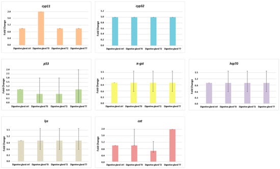 Gene expression results calculated with the 2−ΔΔCT method [54]. Bar graph presentation of the fold change in target genes analyzed (cyp11, cyp32, p53, π-gst, hsp70, lys, and cat) as a function of sampling times in digestive gland of M. galloprovincialis after 3 days MP exposure phase (Digestive gland T0), after 2 days depuration phase (Digestive gland T2) and after 7 days depuration phase (Digestive gland T7). All RT-PCR results are normalized to β-actin and tubulin, the housekeeping genes, and expressed as change from their respective controls. The average values were obtained from three experiments. Significant difference <0.05 is indicated by an asterisk. Values represent the means ± standard deviation (SD).
