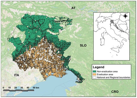 Location of the study area (Friuli Venezia Giulia Region—inset map) divided between eradication and non-eradication areas. Uncoloured polygons identify those territories in which hunting is forbidden. Abbreviations: ITA = Italy; AT = Austria; SLO = Slovenia; CRO = Croatia.