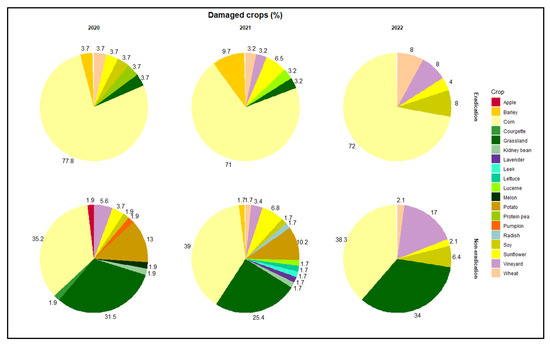 With regard to the non-eradication area, from 2020 to 2022, 18 crop categories were damaged, i.e., apple Malus spp., barley, corn, courgette Cucurbita spp., grassland, kidney bean Phaseolus spp., lavender Lavandula spp., leek Allium spp., lettuce Lactuca spp., lucerne, melon Cucumis spp., potato Solanum spp., radish Cichorium spp., pumpkin Cucurbita spp., soy, sunflower, vineyard, wheat. From 2020 to 2022, there was a significant difference (Fisher’s exact test, p < 0.001) in the percentage of damages among affected crops, with ‘corn’ and ‘grassland’ being significantly more damaged (pnif, p < 0.05) than other crop categories in all years (Figure 2). In 2020, there was a significantly higher (pnif, p < 0.05) percentage of damages in ‘potato’ compared to ‘courgette’, ‘kidney bean’, ‘melon’, ‘apple’, ‘pumpkin’ and ‘soy’ (Figure 2). In 2022, there was a significantly higher (pnif, p < 0.05) percentage of damages in ‘vineyard’ compared to ‘soy’, ‘sunflower’ and ‘wheat’ (Figure 2).