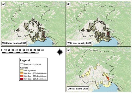 In 2019, single (hot)spots of wild boar hunting density were observed in the south-eastern area of the region (Figure 6a), and, in 2020, both a hotspot cluster and single (hot)spots of wild boar density were observed in the same area (Figure 6b). In 2020, single (hot)spots of official claims were observed in the eastern and south-eastern area of the region (Figure 6c).
