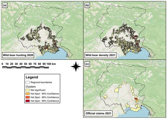 To explore the intensity of wild boar hunting, abundance and official claims at a municipal level, hotspot analysis [42,43,44,45] was carried out using the Hot Spot Analysis (Getis–Ord Gi*) function in ArcMap (v. 10.8, ESRI—2020) [46]. For wild boar hunted in 2019, 2020 and 2021, all the protected areas in which hunting is forbidden were excluded from the analysis, i.e., urban areas, road network, closed-end funds, protected oases, Regional Natural Parks and Reserves, State Natural Reserves, mountain passes, refuge areas, and reproduction, rewilding, and capturing areas [38]. The surface covered by urban areas was extracted from ‘Carta Natura’ FVG 2021 [47], while those referring to the remaining non-hunting areas were downloaded from the Eagle FVG Official Platform [48]. Thereafter, using Google Satellite in QGIS (v. 3.28) [49], the newly created shapefile representing the hunting areas was manually screened to remove the remaining areas (not reported in the original shapefile) in which hunting is forbidden (e.g., beaches, shooting ranges).