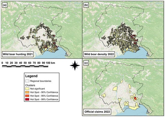 In 2021, both a hotspot cluster and a single (hot)spot of wild boar hunting density were observed in the south-eastern area of the region (Figure 8a), and a hotspot cluster of wild boar density was observed in 2022 in the same area (Figure 8b). In 2022, both a hotspot cluster and a single (hot)spot of official claims density were observed in the eastern and northern area of the region, respectively (Figure 8c).