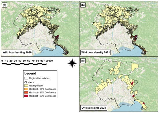 In 2020, both a hotspot cluster and a single (hot)spot of wild boar hunting density were observed in the south-eastern area of the region (Figure 7a), and, in 2021, hotspot clusters of wild boar density were observed in the same area (Figure 7b). In 2021, single (hot)spots of official-claims density were observed in the eastern and south-eastern areas of the region (Figure 7c).