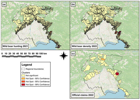 Map showing (a) both hotspot clusters and single (hot)spots of wild boar hunting density in 2021 in the hunting areas falling within the eradication area; (b) hotspot clusters and single (hot)spots of wild boar density in 2022 in the hunting areas falling within the eradication area; and (c) hotspot cluster of official-claims density reported in 2022 in those municipalities falling within the eradication area.