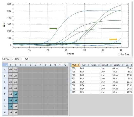 Amplification curves of blood samples for A. platys and A. phagocytophilum (green arrow—amplification curve for A. phagocytophilum in the female dog (Ct = 19.35); yellow arrow—amplification curve for A. phagocytophilum in the male dog (Ct = 38.41); RFU—relative fluorescence units).