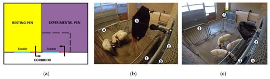 (a) Schematic representation of the resting and experimental pen; (b) experimental pen for negative group (1: feeder; 2: hidden car horn and wall covered with black plastic sheets to prevent the operator from being seen by the animals; 3: umbrella; 4: fence; 5: camera); (c) experimental pen for positive group (1: feeder; 2: hidden doorbell and wall covered with black plastic sheets to prevent the operator from being seen by the animals; 3: fence; 4 and 5: cameras).