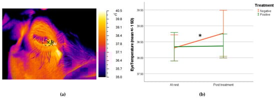(a) Thermographic infrared image of the sheep’s eye with the lacrimal caruncle as the target area; (b) graph showing mean (±1 SD) lacrimal caruncle temperature (°C) at rest and after the treatment for both negative and positive groups (paired samples t-test; * p < 0.05).