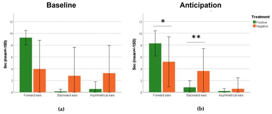 Graphs reporting the mean (±SD) duration in seconds of different ear positions of the negative of positive treatment groups during (a) baseline and (b) anticipation phases (Mann–Whitney U test; * p < 0.05; ** p < 0.01).