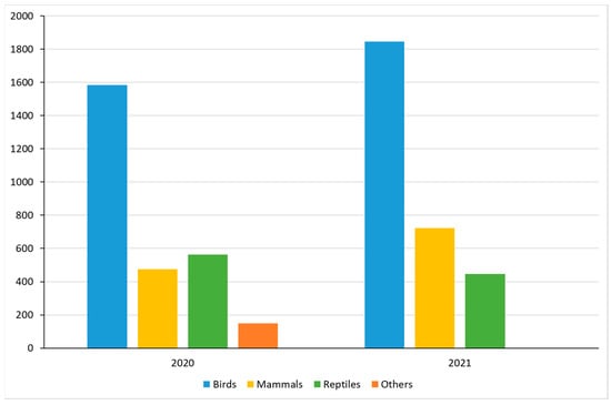 All database records were reviewed for accuracy and formatting consistency. Simple data entry errors by the wildlife rehabilitators (such as minor incorrect spelling of species or place names) were corrected. Subsequently, for this study we used data from two consecutive years (from 1 January 2020 to 31 December 2021). The statistical analysis consisted of characterizing the sample via the analysis of the various categorical variables: taxonomic group (species, order, and class), age group, clinical classification, cause of admission, outcome, and days in the hospital.